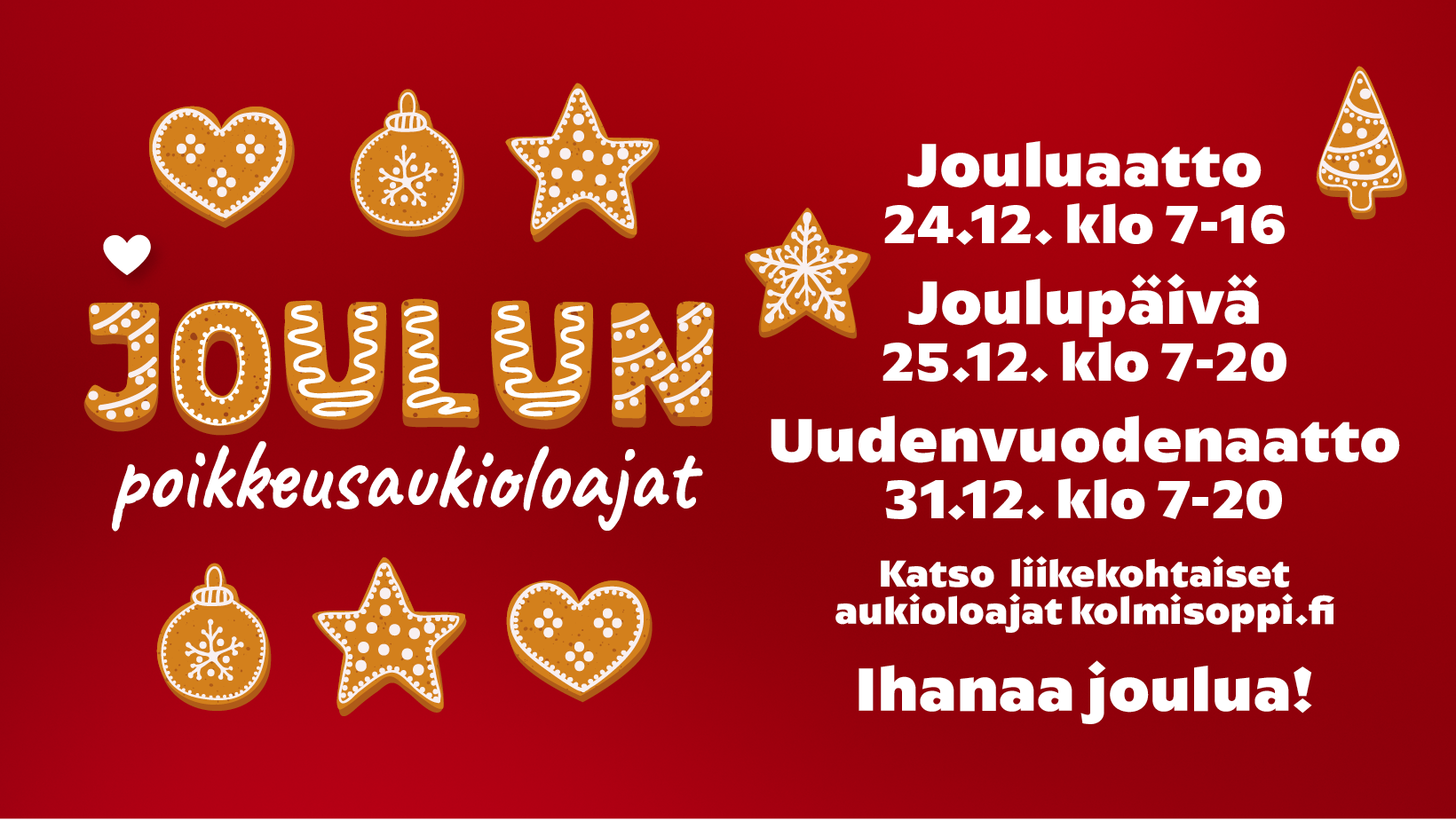 Joulunajan poikkeusaukioloajat: Ke 24.12. klo 7-16 To 25.12. klo 7-20 Ke 31.12. klo 7-20