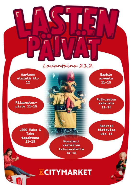 K-Citymarketissa on lasten päivät lauantaina 21.2.2026. Luvassa on monenlaista ohjelmaa lapsille klo 11-15. Lisäksi myös etuja ja tarjouksia, joihin voit tutustua K-Citymarketin verkkosivuilla.