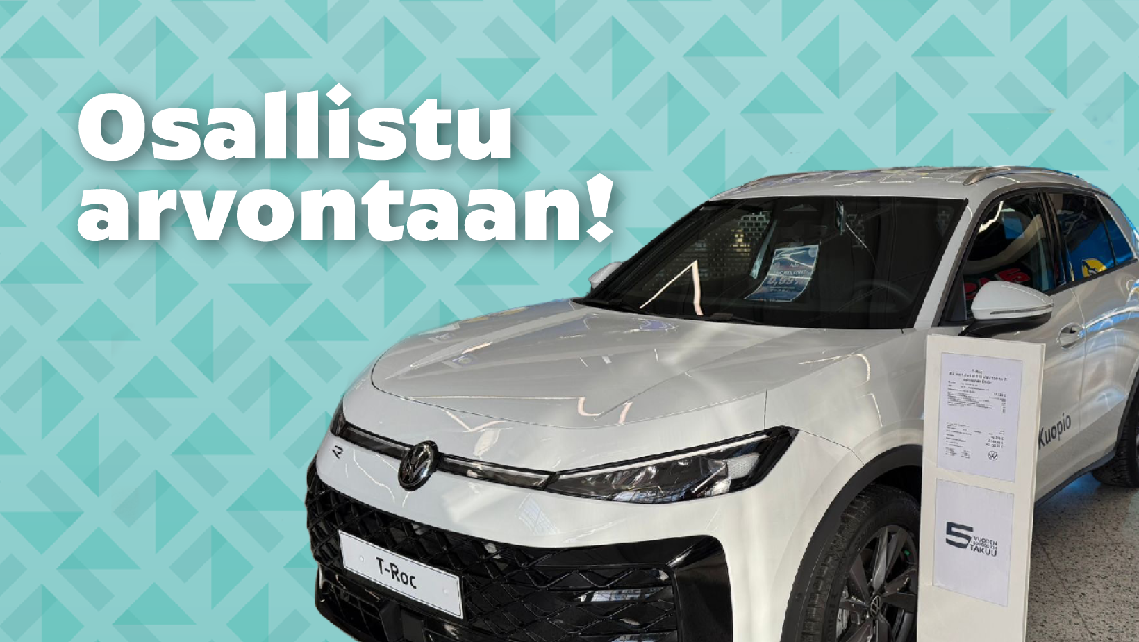 Miltä kuulostaisi huristella viikon ajan täysin uudella autolla, Volkswagen T-Rocilla? Nyt sinulla olisi tähän mahdollisuus! Auton vierellä, Kauppakeskus Kolmisopen aulassa on ohjeet ja QR-koodi, josta pääset osallistumaan arvontaan. Voit osallistua arvontaan 7.4.2026 klo 18 saakka. Arvonnan päätyttyä K-Auto Kuopio ottaa yhteyttä arvonnan voittajaan ja sopii yksityiskohdista.